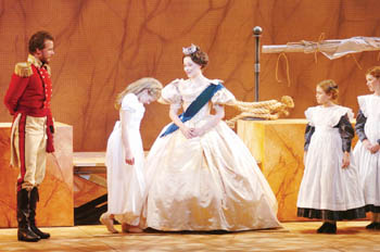 Irony aside, TheatreWorks' lavish, grand-scale production (just check out Zuber's gold costumes in the Timbuktu dream sequence or the beaded pearl fringe on the sleeves and bodice of Queen Victoria's gown) repeatedly holds up Estés' idea that every cultural idealbe it poise, grace or innocencehas its limitations against the beauty in a natural flow of life (and, Estés would add, death). The lean, blonde and delicately featured Mauzy is the Western princess icon. She remains poised and statuesque in the most emotional moments. On the other hand, the members of the African ensemble have shapes that are both thin and thick, tall and squat, voluptuous and firm. These characters allow their bodies to be fully expressive. Choreographer Andy Blankenbuehler has given them very earth-based, root chakra, women-who-run-with-wolves, fire-in-the-loins dance moves that are maybe less about African dance than about full acceptance of the body's natural life-affirming impulses. As spirits or dream figures, they dance among the Londoners, and their dark skin tones swathed in varied, patterned costumes make a nice counterpoint to pale girls, dressed uniformly in white, dancing waltzes. Estés would congratulate Blankenbuehler (and director Susan H. Schulman) for recognizing diverse forms of expression and beauty. While this is incidentally a play about the interrupted love of a father and daughter, all the real hold-your-breath moments come in the scenes between Miss Minchin, brilliantly played by Kimberly King, and Sara. Even in her humbled condition, Sara's steadfast grace makes Miss Minchin feel ridiculous. "We're all a joke to her." When Minchin sings the song "Had I Been Lucky" (calling Sara a "freak of luck"), King's Minchin is far from the uptight paragon of sour grapes; nor does King stop at showing the wounded woman behind the cruel one. Almost subversively, King lets us see the glorious woman behind the self-inflicted torturer, a potential charmer who simply won't let go of an impossible icon. Yes, Lippa's music, the high quality singing voices, the large production numbers, Crawley's book, all produce an assuring, feel-good arc, but in the undertones this production may leave you wondering what princesses we might still be stifling for the sake of unrealistic ideals.