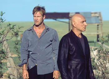 Arriving at the FBI's base in Albuquerque is Thomas Mackelway (Aaron Eckhart). Mackelway is still under a cloud for having blown a perfectly good collar by acting like a vigilante. His case of stress is worsened when he receives bizarre messages from a killer who taunts him with mutilated cadavers. Turns out that the unnamed killer's signaturecutting off the eyelids of his victimsis actually his way of telling Mackelway to keep his eyes peeled, as more clues are coming. We've seen, in the early moments, that the murderer is Ben Kingsley, looking like an deadly Mr. Clean, who has been stalking and killing a seemingly random group of men. It doesn't take much detective skill to surmise what links them all. Eckhart is an intriguing combination of trustworthy chin and untrustworthy mouth, the residue of playing so many creeps in Neil LaBute's movies; there's not much love interest stimulated by his FBI partner, Fran (the lugubrious Carrie-Anne Moss).