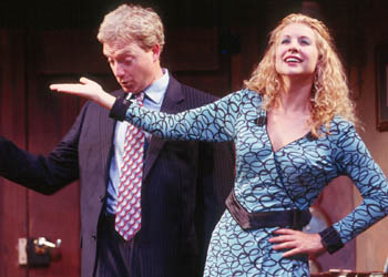 While the first act of Nothing On is reprised in the distance, we also watch the characters backstage conduct their own counterfarce "between the lines." They carry on arguments and launch threats in silence or pantomime ("noises off") to the beat of their stage entrances and exits. The effect is like a brilliant fugue that recontextualizes one melody by surrounding it with parallel melodies. Only a very tight production can make everything click, and the performance I saw was tight, from synchronized pass-offs to multilevel sight gags. The audience roared through the entire second act and on into the third--set front stage again. As the inner play sinks amid frantic extemporizing, misplaced props and missing actors (apparently waylaid backstage), the outer play peaks with aching sides.