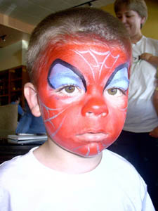 Carr sweetly coaxes him with reverse psychology. "It's OK, Mark. You don't have to get painted. I'm going to work on this other little girl who's been waiting." Avila looks at her with his wide brown eyes and quietly concedes, lifting his face toward the middle-aged woman wearing a pink beret and a friendly smile. Carr gently places her hand under his chin and bends to cover all the nooks of his small face with her brush. When she is done, Avila examines himself in a hand mirror and becomes captivated. His face is a web of black and blue lines over a red background. His eyes are pointy black circles, and a tiny spider crawls across his cheek. He wears a serious expression now, as if planning to scale buildings with his fingertips.