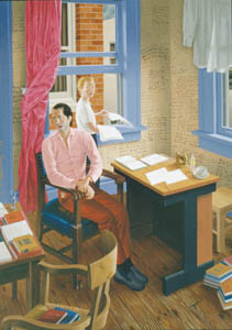 IN A SNOWY woods, a tracery of deep footprints leads to a brick incinerator. Three men have stopped hereone leans against the chimney; one collapses backward onto a snow bank; one hunches forward, his face in his hands. A fourth man, separated from the others, stands and stares upward. Robert Schwartz's 1999 oil Would That I Didn't Know reads like a panel from a storyboard for a thrillerA Simple Plan maybe (that standing figure in his red watch cap conjures up Billy Bob Thornton's character). This gang certainly looks guilty of somethingunauthorized cremation at the very least. Of course, that interpretation is wholly mine; Schwartz's surface is as devoid of narrative depth as it is of spatial depth. The implied story is as much an illusion as the tricks of perspective and shading used to create an image that implies three-dimensionality. Schwartz, a prolific but relatively unsung San Francisco-based artist, finally gets his due in the San Jose Museum of Art's superb new show, "Dream Games: The Art of Robert Schwartz"and in the excellent coffee-table catalog by Barry Schwabsky and museum curator Susan Landauer. Sadly, this recognition comes only after Schwartz's untimely death in 2000 at the age of 56. Painted with exquisite clarity and detail, Schwartz's works in oil and gouache belie their small size (most are no more than about 7 by 8 inches). Whole worlds seem to open up within the frame as Schwartz's subjects pursue strange and troubling missions.