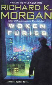 Woken Furies is Richard Morgan's third novel featuring mercenary and private investigator Takeshi Kovacs, set in a future where humanity has developed a technology that allows us to store our lives, experiences, our very souls in the "altered carbon" of a cortical stack. If you're killed, your stack can be removed, and you can be "resleeved" in a new body, assuming you can afford it. Morgan's Altered Carbon was a violent noir set in San Francisco; Broken Angels resurrected Takeshi in mercenary mode intervening in a planetary revolution. Here, he combines the two as Kovacs returns to his home, Harlan's World. While doing mercenary work, he finds himself drawn into a criminal conspiracy that hopes to foment revolution. The violence remains intact, but Kovacs has become weary and leery of his once-favorite pastime. Fortunately for the reader, Kovacs has been Napstered. One of the ruling elites has illegally copied and sleeved a younger Kovacs to hunt the original, bringing new meaning to self-conflict. Great surfer settings and violence recollected in tranquility make this a more emotional but no-less-gripping novel than its predecessors. (By Richard Morgan; Del Rey Books; 450 pages; $24.95 cloth)