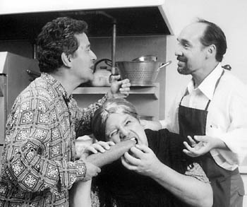 Chow Time: Chicho (Jim Rodriguez), La Nona (George Mauro) and Carmelo (David Angelo) face the foodstuffs in 'La Nona.'