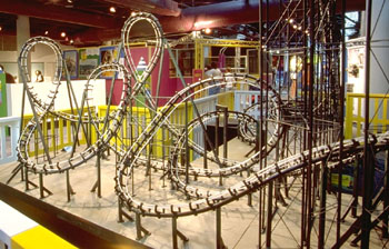 A miniature replica of a roller coaster named the Black Plague sits on the other side of the room. Visitors can press a button and make it work. Kids can even build their own roller coasters with wooden parts or explore the physics of roller-coaster loops. The Roller Coaster Parts Department also shows off some intricate machinery for people to check out.