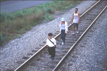Tracking Shot: Peter Dinklage (front), Patricia Clarkson (center) and Bobby Cannavale walk the rails in 'The Station Agent.'
