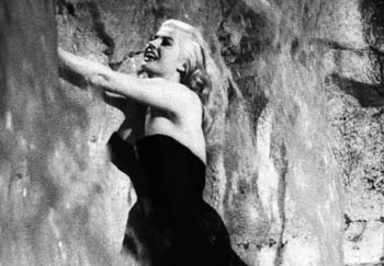 Sylvia has a bespectacled alcoholic grump of a boyfriend (Lex Barker"He played Tarzan once," exactly as a paparazzo comments), and he finally puts the kibosh on the evening. Was Fellini drawing some tabloid parallel between Arthur Miller and his unstable bride. If so, the good-natured way Ekberg does Monroe, and the helpless admiration with which Marcello watches her, is the most affectionate part of the movie.