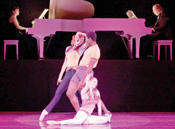 Another captivating piece featured Ramon Moreno as Charlie Chaplinshrinking his body into a no-neck geek, the shrug, the Chaplin waddle, the quick pass of the hat integrated into the dance like a skillful busker. And crowd-pleaser du jour would have to go to Dalia Rawson's Pink Panther; her kitty-paw hand motions and minxy hips shown off by white huggie pants and a low-slung pink belt (costumes by Maggie Heaman).