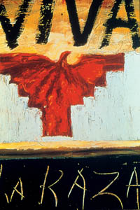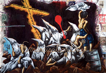 In a frontal attack on American racism, Travis Somerville's bold Raft of the Grand Wizard references a firmly codified classic, Gericault's Raft of the Medusa. This raft is manned by hooded Ku Klux Klan members and topped by a mast in the form of a burning cross. (The dramatic original is reproduced on the cover of the Pogues' Rum, Sodomy and the Lash album.) As UCSC art professor Jasper Rose used to say of the Gericault, "Here was the Jaws of its day."