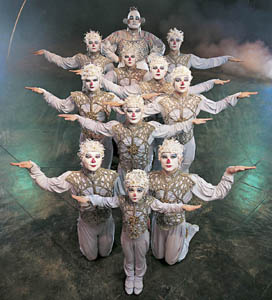 Alegria also toots a great klezmeresque rock-opera soundtrack by René Dupéré, the bestselling soundtrack of all of Cirque de Soleil's various programs. The White Lady sings most of it, as she meanders across the stage and occasionally through the audience like an ambulatory wedding cake. Be forewarned, though: this is a wedding cake with claws. During the second half of Alegria, my poor date, who had moments before been bad-mouthing audience participation, was plucked from the seat beside me and taken onstage to dance. He was then strong-armed by the Strong Man, who carried, him, purselike, back to the howling audience. Lesson: When the performers come through the audience, don't make eye contact! No eye contact! (Unless, of course, you want your 15 seconds of flame-faced fame there and then.)