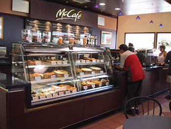 Con Freeman, unquestionably wide-eyed from a week of coffee testing, watched Biter's tentative sipping intently. He himself is a coffee connoisseur, he says: "I know how important the coffee is. If we mess up your latte, it could mess up your day. So we take it very seriously." Each barista employed at the McCafe undergoes 40 hours of coffee training. The espresso itself is an imported blend of beans specially roasted. Even more surprising, Biter's medium latte cost $2.20. A large-size single shot latte is $2.50, and frappés range from $2.85 to $3.
