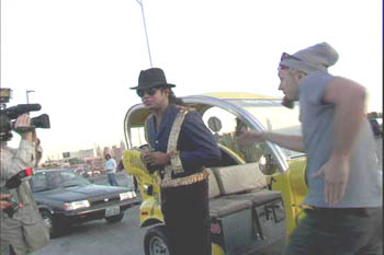 "Hey, what's going on here?" I scream, as if I just happen to be driving by with an oblivious Michael Jackson. He belts out "Leave Me Alone." It takes a second to sink in as Michael waves from the golf cart. First, there's a look of "Maybe that really is Michael?" followed by laughter and (I'm almost positive) jubilant joy from even the most hardened, bitter person. For a brief moment, our Michael Jackson actually becomes Michael Jackson. I see the smiling faces--the security guards, the mom with big hair and her angry kids, the media--because, finally, something has actually happened in front of the CMX studio gates.