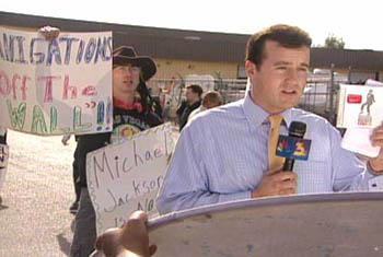 A well-groomed TV newscaster sets up his camera right in front of the CMX gate. As he addresses the camera, giving a live update on what's going on, I park myself right behind him and start frantically waving my idiotic signs. For his viewers, Monroe Bennett is a representative the sea of fans showing Michael Jackson support. He even refers to me during the broadcast.