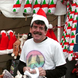 Exiting the park at Paseo de San Antonio walkway, I chatted with Doug Bickle, a self-proclaimed ex-hippie, who was hawking an interesting array of inflated Santa Clauses, green aliens with Santa Claus suits, reindeer and happy faces. When I mentioned I was working on a column about the Animated Displays in the Park Celebration, he joked that he wanted "front page exposure." Doug then started singing, impromptu, the lyrics to "On the Cover of the Rolling Stone." A fair enough rendition. I told him that page one might be a problem, but page 14 or so was possible.