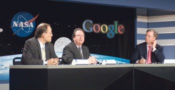 (Left to right) In a signing ceremony on Sept. 28, 2005, NASA wonk Scott Pace and NASA Ames boss Scott Hubbard discussed their plans for 'bio-info-nano convergence' (we swear we didn't make that up!) and transferred title to the universe to Google CEO Eric Schmidt (OK, maybe that part we did).