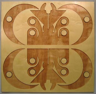 At first glance, the work lining the walls doesn't disprove this theory. Using a rather marvelous die-cut saw, Hardman has hewn curvy, pretty shapes out of thick wood panels, leaving negative spaces on the panel where the pretty shapes once were. Like a board puzzle for an oversized toddler, these panels are lovely.