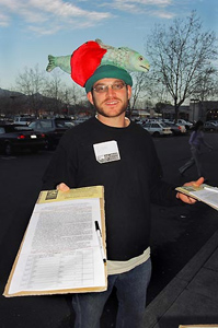Tomato Fish Hat: A volunteer gathers signatures for the GE ban set to go on the ballot.