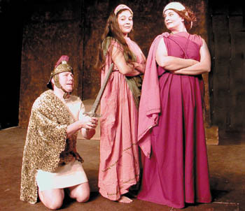 At Their Mercy: Cinesias (Jonathan Graham) begs for sexual healing from Myrrhine (Sara Hernandez) and Lysistrata (Sandra Ish-Albini).