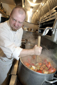 Southern Hospitality: Chef Mike Jewell guards his jambalaya carefully, and with a threatening 'Argh!'