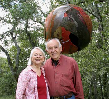 World on a String: Dr. Walter Byck and Marijke Byck-Hoenselaars beneath Cloverdale sculptor Dale Hawley's 'spirosphere.'