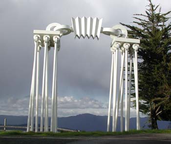 Getting viciously lost on rural roads on the way to sculptor Robert Ellison's home studio, on the other hand, provides chance jack rabbit encounters and views of the blonde, rolling Cotati hillsides and the massive white steel Arch (shown above) as assurance that one has finally, thank goodness, arrived.