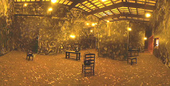 "And here we are sitting, looking at the shadows. There is a known factor, and we feel OK about it. There might be," he chuckles dramatically, "a lion out there for all I know! It's a dark installation, both physically and metaphorically. But I'm inside the cave, too. It's a sad thing, but inside it's comfortable. It's warm and womblike and comforting but nevertheless . . . ." He trails off reflectively.