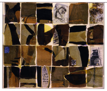 Such effort isn't hinted of in her painting, cool spacious abstracts that for the "Doublecounterpoint" exhibition are greatly concerned with the pattern and surface of collage upon panels. She uses the grids and straight lines that mark the architecture and gardens of her childhood as a recurring motif, utilizes the shape of the zero because, she says, "the zero needs another number, it cannot stand alone," and draws from music, myth, time, and the Zen concept of energy to inform her work.
