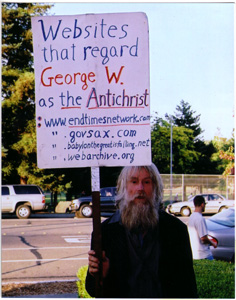 Craig Davis, who works as a Buckelew Programs' independent-living-skills counselor helping the disabled homeless transition to housing, took this photo of an unidentified man while waiting in line to see 'Fahrenheit 9/11' at the Rialto Lakeside Cinemas. The man, evidently rallying a cause close to theatergoers' hearts, only allowed Davis to take the shot after ascertaining that Davis wasn't from Homeland Security.