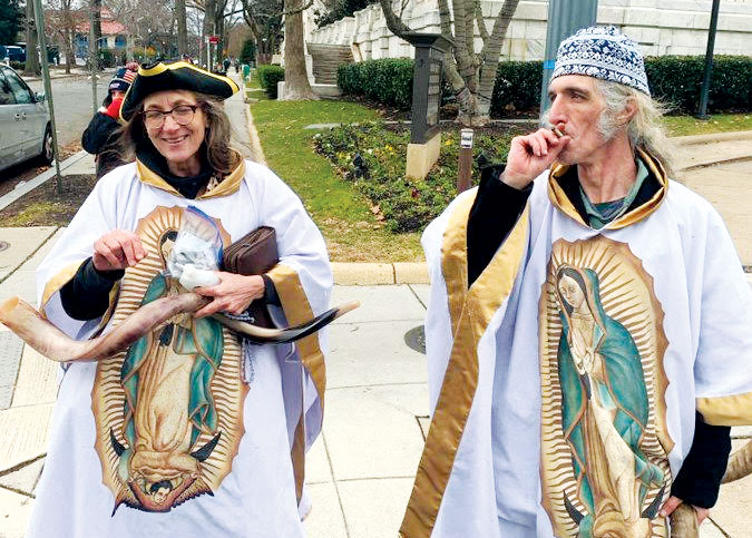 They haven’t really spelled out how he did that. The church founders, Anne Armstrong and Alan Gordon, were photographed on the streets of D.C. decked out in flowing, white robes bearing images of the Virgin Mary. They carried shofars–ram’s horns–which witnesses reported on Twitter they were using to smoke weed through.