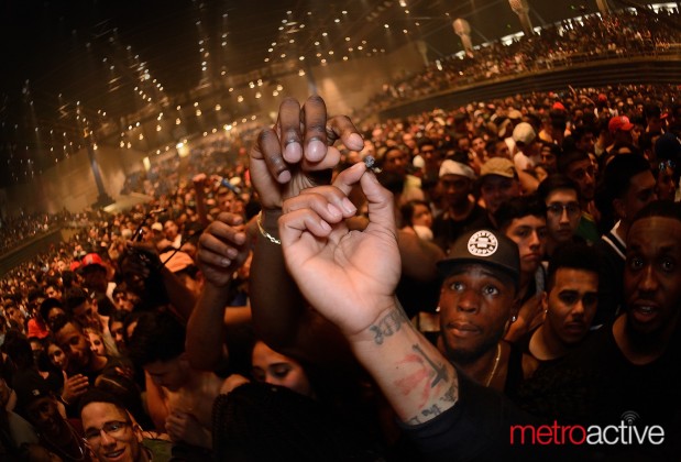 On Saturday, he capped his Purple Reign tour at the sold-out, sweetly hazy SJSU Event Center. The number of people over 35 could be counted on two hands and a foot. With his bleach-tipped dreads pulled back, clad in an all-white ensemble and drenched by overlapping blue and red spotlights, Future initially stood onstage alone–sans band, backing DJ or posing hype men—literally and figuratively peerless.