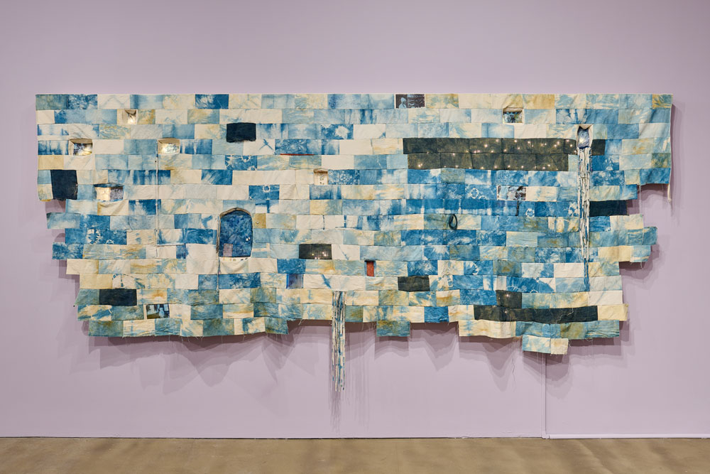 At the opening, I make a beeline for Namita Paul’s work, W.M. 265. A huge canvas and burlap wall-hanging with additional components of indigo dye, sequins and acrylics, the work draws from personal and political histories, engaging with themes of home, rupture, repair, architectural space, memory and time. W.M. 265 was triggered by artifacts and memories of Paul’s childhood home in Jalandhar, India, a building where her grandparents lived after being displaced by the Partition of India.