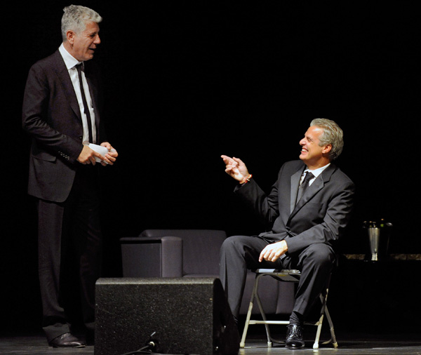 Billed as the “Good vs. Evil Tour,” for more than two hours Ripert and Bourdain shared their thoughts on food, cooking and the restaurant industry, first under the premise of an interrogation and later as two bros sitting in easy chairs talking shop over a couple of cold ones.