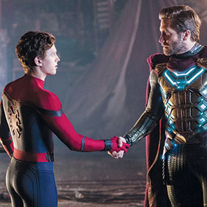 Spider-Man: Far From Home gives MJ even more agency during a final careen through Manhattan. It’s not a girl’s lyrical ride on a superhero’s powerful shoulder, as it was in 2002, but a terrifying trip MJ vows never to make again. To his credit, director Jon Watts takes the odd route whenever possible; he basks in the fun of hanging with teen pedants smart enough to tell a spear from a halberd. Sometimes it seems Watts has an altar somewhere with a DVD collection of Freaks and Geeks on it, surrounded by candles and incense. Still, there’s relevance to burn in Spider-Man: Far From Home‘s payoff in villainy that deals in distraction and deepfakery, with arsonists playing firemen, and smoke and mirrors.