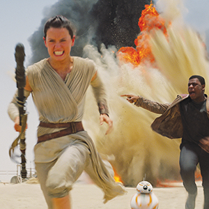 Ridley’s Rey is a junkyard scavengeress, circumstantially marooned on the dune planet Jakku; there she encounters an Imperial army deserter named FN2187, or “Finn” (John Boyega, of Attack the Block). Finn is on the run after he helped a rebel pilot (Oscar Isaac) escape; a secret important to the rebellion is hidden aboard a droid they both know—the robot is typically wordless but eloquent. Pantomime is important in these movies: actors flailing around in suits of plastic armor or Chewbacca losing his temper. Abrams has to note the horror of the renegade Storm Trooper through body language and the blank face of his helmet, striped red with blood.