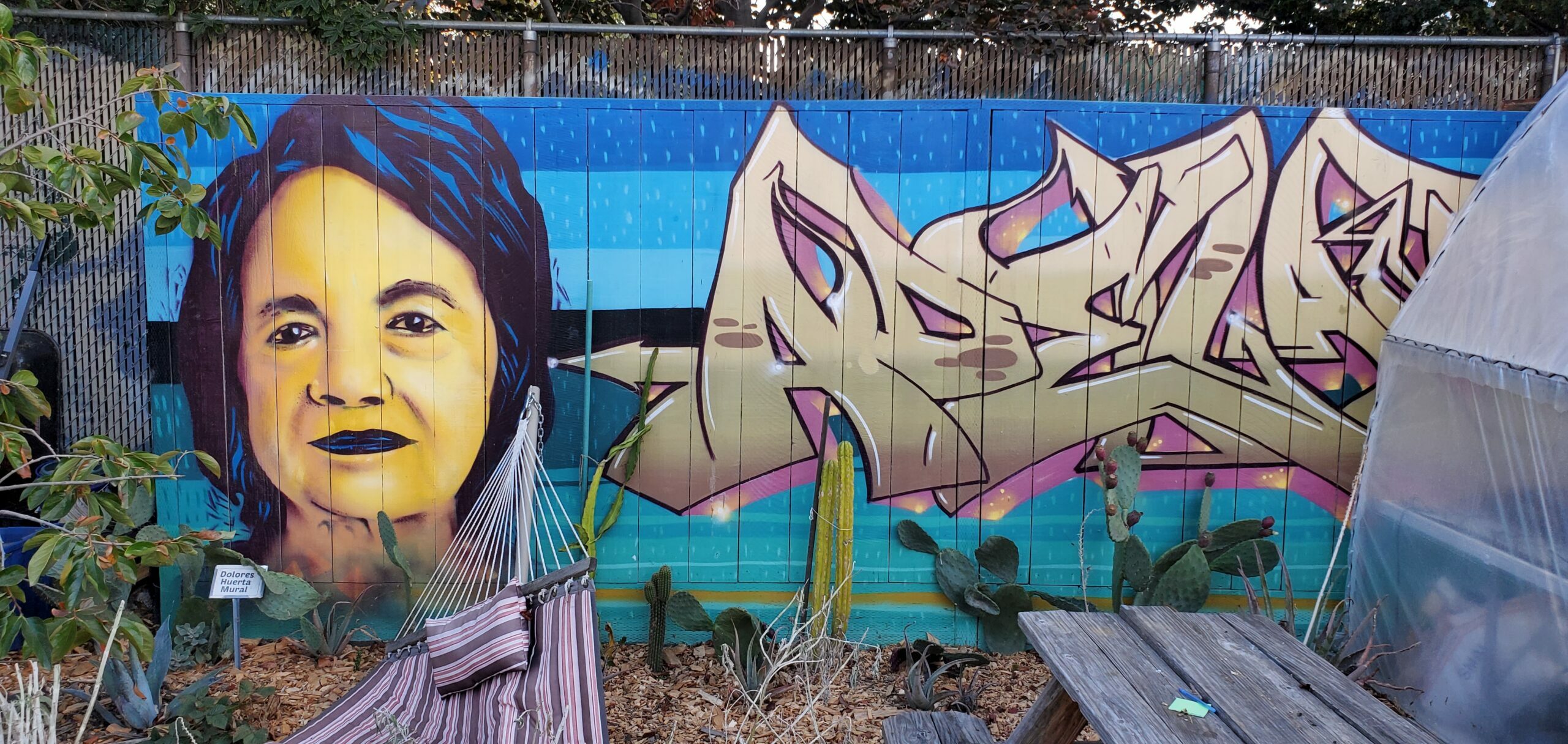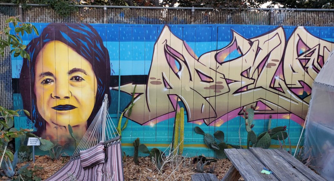 After the poetry reading, I explored more of the garden. The chemical-free ecosystem featured more than 60 different plant species. Everything was sustainable. It all went back into the garden. A mural of Dolores Huerta was painted on the fence, a refreshing contrast to hideous crud like “Providence Credit Union Event Center” or “CEFCU Stadium.”