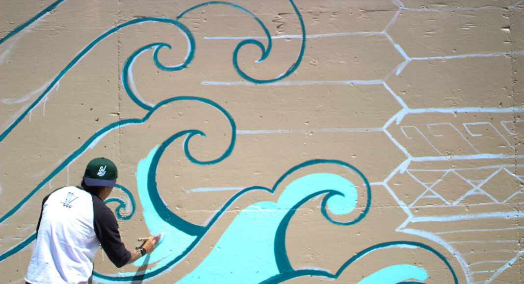 The mural depicts a series of large waves pushing a canoe forward. Its edge meets another mural by fellow Humble Beginnings artist Ricardo Gonzoe Gonzalez, featuring a woman adorned in California poppies. Both celebrate the generations of immigrants that have made the Golden State what it is today, a call to remember their culture and preserve its identity.