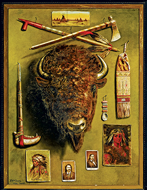 Both of these come from the accumulation of Ed Peterson, proving that members of the Cooper Cult often constitute stories themselves. Peterson is about to retire from the Santa Clara County Crime Lab, where he displayed Cooper paintings above his desk because he didn’t have room for them anywhere else. Other collectors who donated works include Greg and Petra Martin, who supplied Trophies of the West, a painting of a gigantic buffalo head surrounded by smaller replicas of other Cooper paintings. He apparently knew how to recycle his own work for profit. History San Jose also loaned a few pieces.
