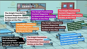 In the Archive408 take, all of the tables save one are populated with the same four groups: The Knight Foundation, Content Magazine, the San Jose Downtown Association and Garden at the Flea. One small table in the corner offers up three more targets: Burning Man artists, tech transplants and “the same 3 ‘local’ artists who get all the $$$.”