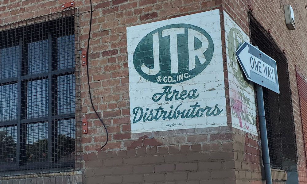 It doesn’t stop there. Most local history nerds and writer-vagabonds will probably identify this giant still-existent brick warehouse by the hand-painted green and white signage added much later, which says: JTR & Co. Area Distributors. If one knows the legacy of treasured San Jose sign painter Rey Giese, his signature style is obvious, although you may have to shuffle by on foot to see it. His name is right there underneath the JTR logo at Third and Keyes. Everything else left over from that business—the office and parking signs, plus the numbers above the receiving docks on all sides—are the work of Giese. The words and numbers have faded over the decades, but they clearly belong to him.