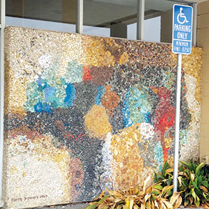 When one first enters this crumbling landscape, the old, shuttered Bank of the West building, a mid-century classic, appears first. The building features an amazing and intricate Harry Powers mosaic, Vibrant Galaxy, a massive 1963 artwork tediously constructed with stone and glass tesserae in concrete. A crane was needed to install the 7-by-9-foot artwork 57 years ago.