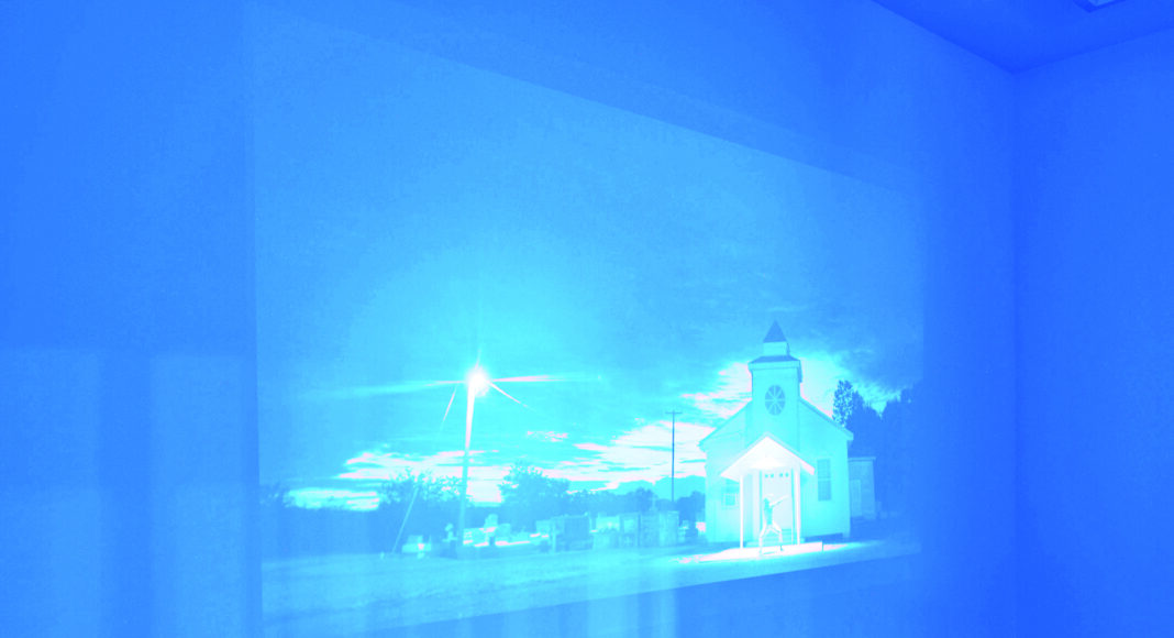 Blue dominates the space, incorporated in neon signwork, light from the skylights and thick sheets of blue plastic which hang over the alcove where Burrell’s film is projected onto the wall.