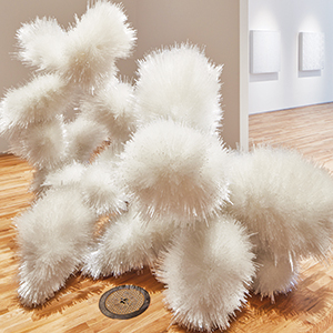 Donovan is known for using vast quantities of everyday materials like plastic cups and straws (see an earlier work entitled Haze from 2003). The Cards series disguises this fact in a way that the sculpture does not. Untitled (2016), according to Pace, is made of “tens of thousands of clear acrylic rods.” Physically, it resembles a giant tidepool creature arisen from Neptune’s distant atmosphere. Donovan explains that her process is “a kind of dialogue with a chosen material. Chance is of primary importance in the beginning as I experiment with a new material. As a project progresses, the dialogue becomes more nuanced.”