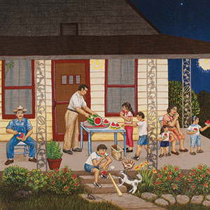Two different Carmens with two very different practices both catch the eye. Carmen Lomas Garza, born in Texas but now a San Franciscan, is represented by a lithograph entitled Sandia. Under an awning on a hot summer night, a father carves up a watermelon for his family to share. Their brightly lit front porch keeps the blue-black sky at bay. Garza paints a swinging bench and flowers in the front yard the same watermelon-red that emphasizes a harmony within the group. Carmen Argote on the other hand has three of her Folding Structures on display. Made from papier mâché, paint and acrylic plastic core, they are versions of household items like ironing boards, sheets and towels but transformed by minimalism. They could be items from a Martha Stewart catalogue if Martha Stewart had abandoned all sense of practicality and utilitarianism.