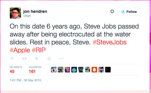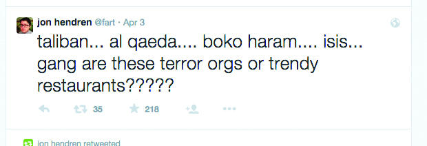 I’m one of those 78,000. For more than a year, I’ve subscribed to Hendren’s tweets. He publishes about five or six a day, along with a dozen or so replies to other users, covering an absurd range of topics. In easy succession, he’ll praise the comedic gall of David Letterman, then mock Apple Pay, then pitch “Chili Lite” as a new food.