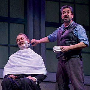 Next, a street peddler (Spencer Kiely) tells a crowd about a hair-growth elixir. An Italian barber appears (played hilariously by Noel Anthony) as the drug’s proprietor. Sweeney challenges the man to a barber-off, in which he triumphs. Soon Todd’s services are in demand. Mrs. Lovett tells everyone that Todd has a barbershop above her own store. The judge plans a visit and Todd plans for revenge.
