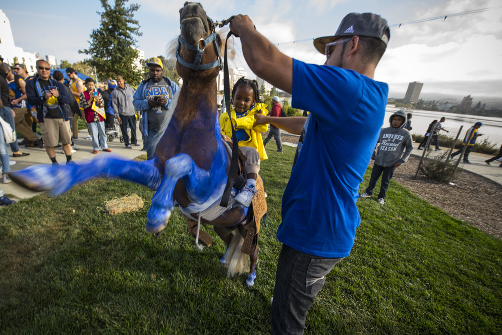 The Golden State Warriors took to the streets of Oakland this morning to celebrate the franchise’s first NBA Championship in 40 years. Fans from all over the Bay Area flooded downtown Oakland to cheer the team. Warriors fans both young and old sported blue and gold hats, jerseys and T-shirts, waved flags and held up homemade signs in a jubilant display of team spirit.