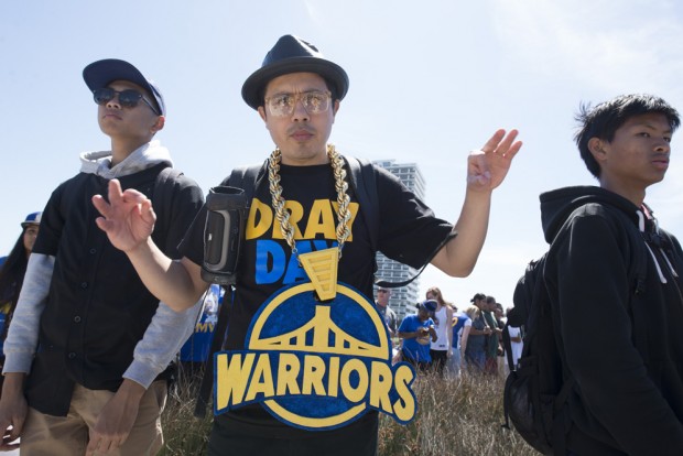 The Golden State Warriors took to the streets of Oakland this morning to celebrate the franchise’s first NBA Championship in 40 years. Fans from all over the Bay Area flooded downtown Oakland to cheer the team. Warriors fans both young and old sported blue and gold hats, jerseys and T-shirts, waved flags and held up homemade signs in a jubilant display of team spirit.
