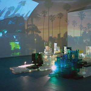 The images feature palm trees standing in formation against a blue sky washed in reds, oranges and yellows. Buildings line the horizon and merge together. Shadows swallow them up. But as your eyes get accustomed to the darkness, they also focus on the sculpture, a model city.