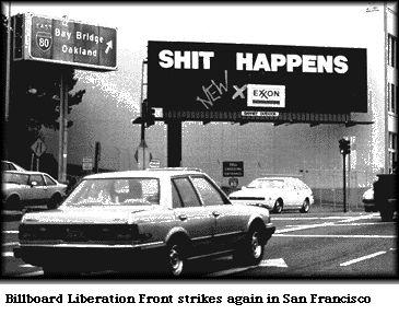 Which brings us into the shifty hours of a San Francisco morning. Jack Napier, of the Billboard Liberation Front (BLF), is about to add three-foot-high rhetorical zits to an urban canvas. Napier--a nom de guerre copped from Batman's arch-nemesis, the Joker--and a couple of BLF "field operatives" linked by hand-held CB radios to cop-spotters below, have scrambled up the face of a billboard using rock climber's gear. Dangling in front of an advert for the Plymouth Neon, Napier uses a can of red spray paint to restyle to billboard's message, transforming the word "hip" into "hype."