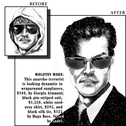 Whatever you think of his philosophy and methods, one thing's for sure: The Unabomber is overdue for a fashion overhaul. (If Mr. UnaB. doesn't turn up on Mr. Blackwell's list this year, we'll eat our rakishly angled chapeau!) When you've been on the lam for 15 years, a chameleonic commitment to the sartorial is not a maybe, it's a MUST. Yet judging from his publicity still (above left), Mr. UnaB. is hopelessly locked in the clunky couture of the late 1970s. Note the Chris Kristofferson-circa-Star-Is-Born-remake perm peeking out from underneath the sweatshirt hood. And that hood, well, the less said about it the better. Media savant that he is, there's simply no excuse for such an image faux pas, anarchist or no anarchist.