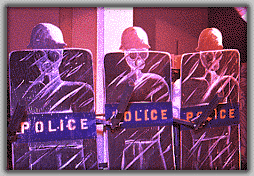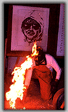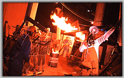 Now Sirena has a megaphone, and she's shouting at another (human) guy who is zipped into a leather S&M mask, and looks like "The Gimp" in Pulp Fiction. He's wielding a serious-looking machete. Here's where I start to get confused, and my conscientious reporter's notes get more illegible than usual. There are percussive blasts--recorded sounds of battlefield explosions, airhorn pollution, megaphone babble, etc. A 12-foot-tall stationary robot with a TV set for a head (filled with an extreme close-up of Rush Limbaugh's substantial, sweaty pate--now I'm really scared) smashes its cymbals-for-hands together; like those toy monkeys, the difference being that every time this iron-scaffold primate bashes its copper fists together, an arc of electricity ignites a jet of propane gas, yielding an orangy explosion. Assorted peripheral SEEMEN are stumbling through the confusion, wielding backpack-mounted air cannons and air horns-slash-public address loudspeakers.